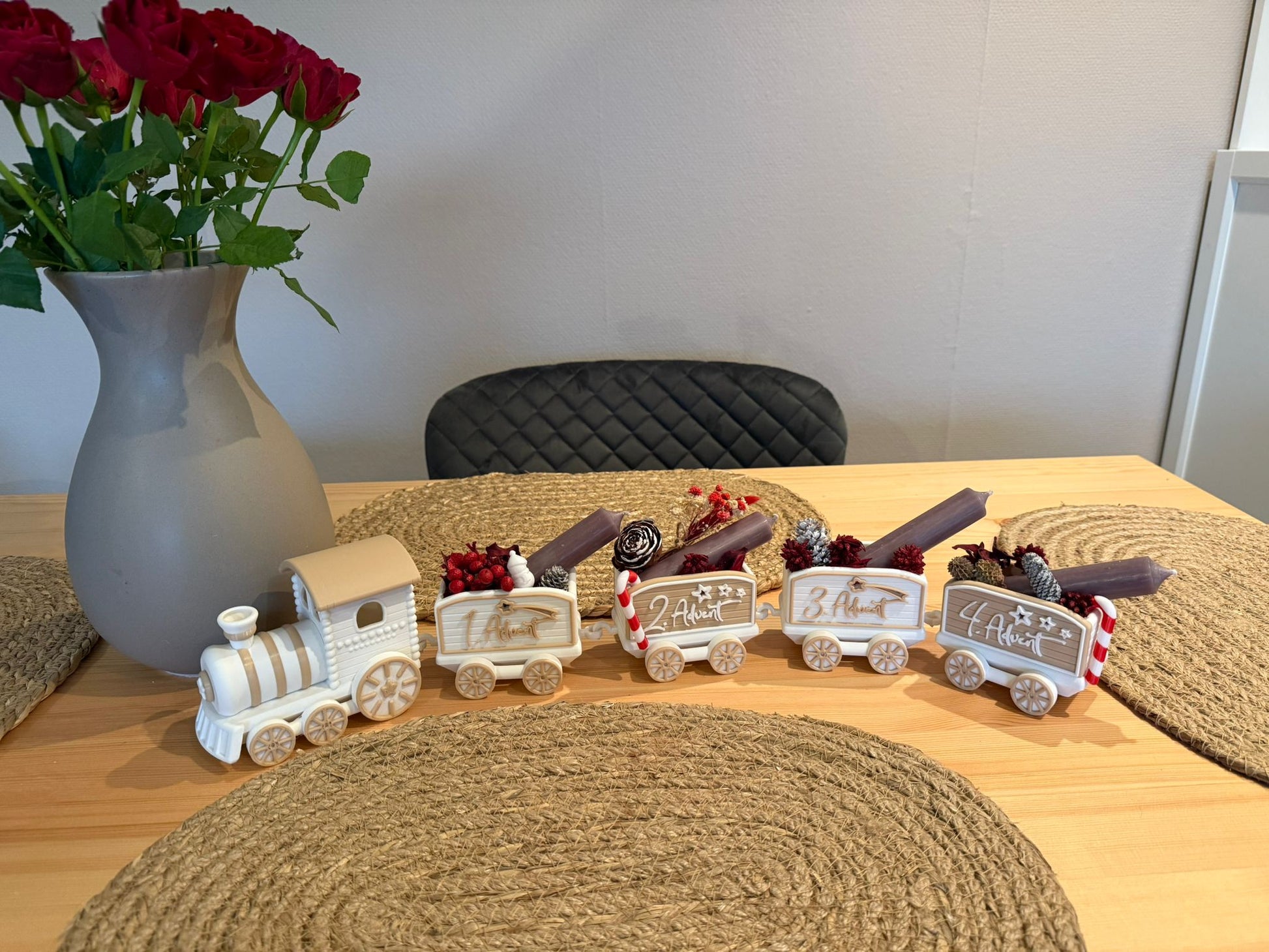 Der 3D-gedruckte Weihnachtszug trägt auf jedem Waggon eine Zahl – für jedes Adventswochenende ein kleines Stück Vorfreude 🎄💖