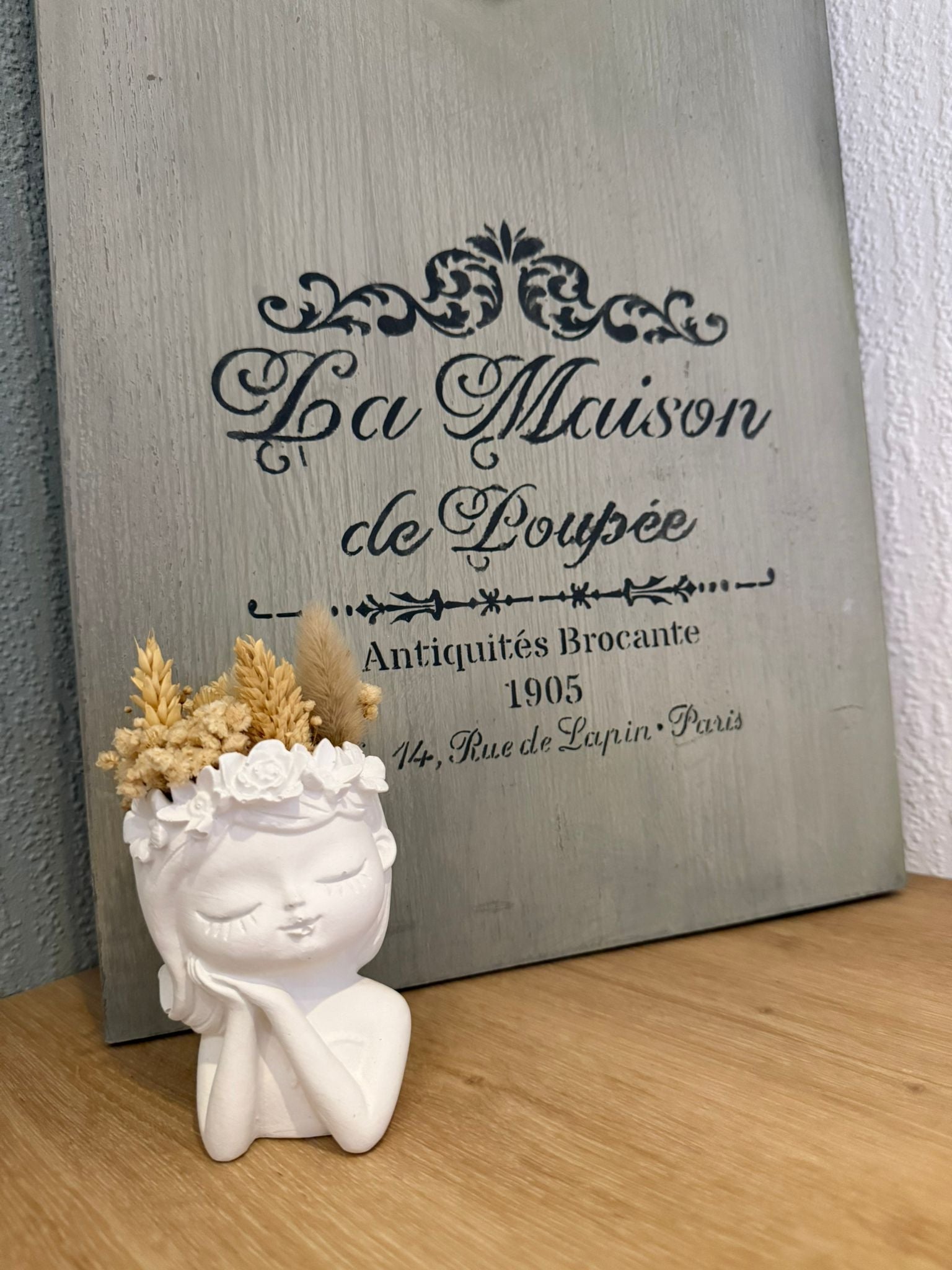 Ein Kunstwerk voller Ausdruck und Natürlichkeit: Der handgegossene kopfförmige Blumentopf aus Gießbeton besticht durch seine klare Form und die zeitlose Betonoptik. Oben hohl gearbeitet, ist er komplett mit sorgfältig ausgewählten Trockenblumen gefüllt – eine harmonische Kombination aus moderner Betonkunst und zarter Floristik.