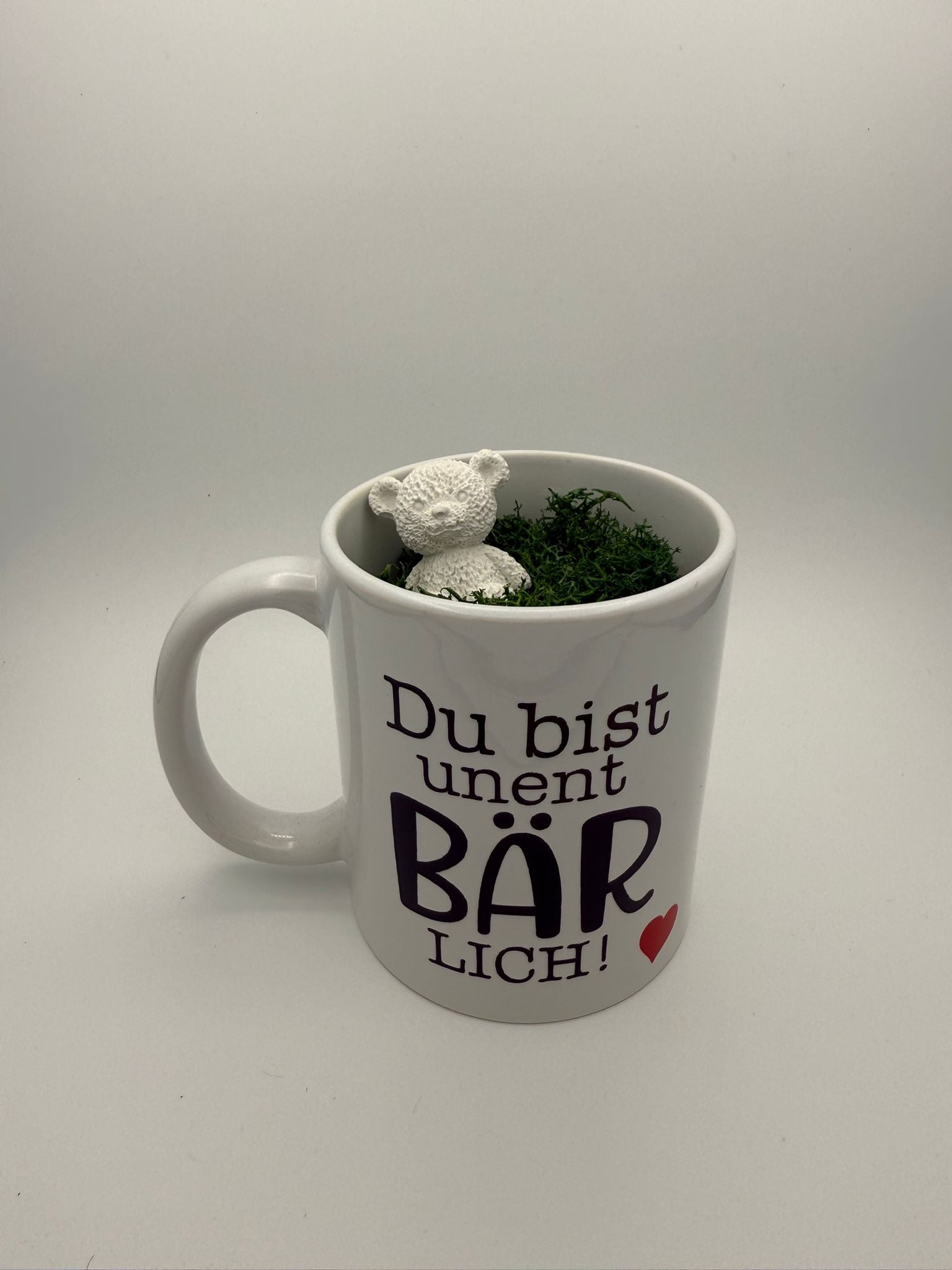 Ein Geschenk mit Herz und Humor: Diese handgemachte Tasse trägt den liebevollen Spruch „Du bist unentBärlich“. Gefüllt ist sie mit dekorativem Moos, in dem ein kleines gegossenes Bärchen aus Beton sitzt – eine zauberhafte Kombination, die sofort gute Laune macht.