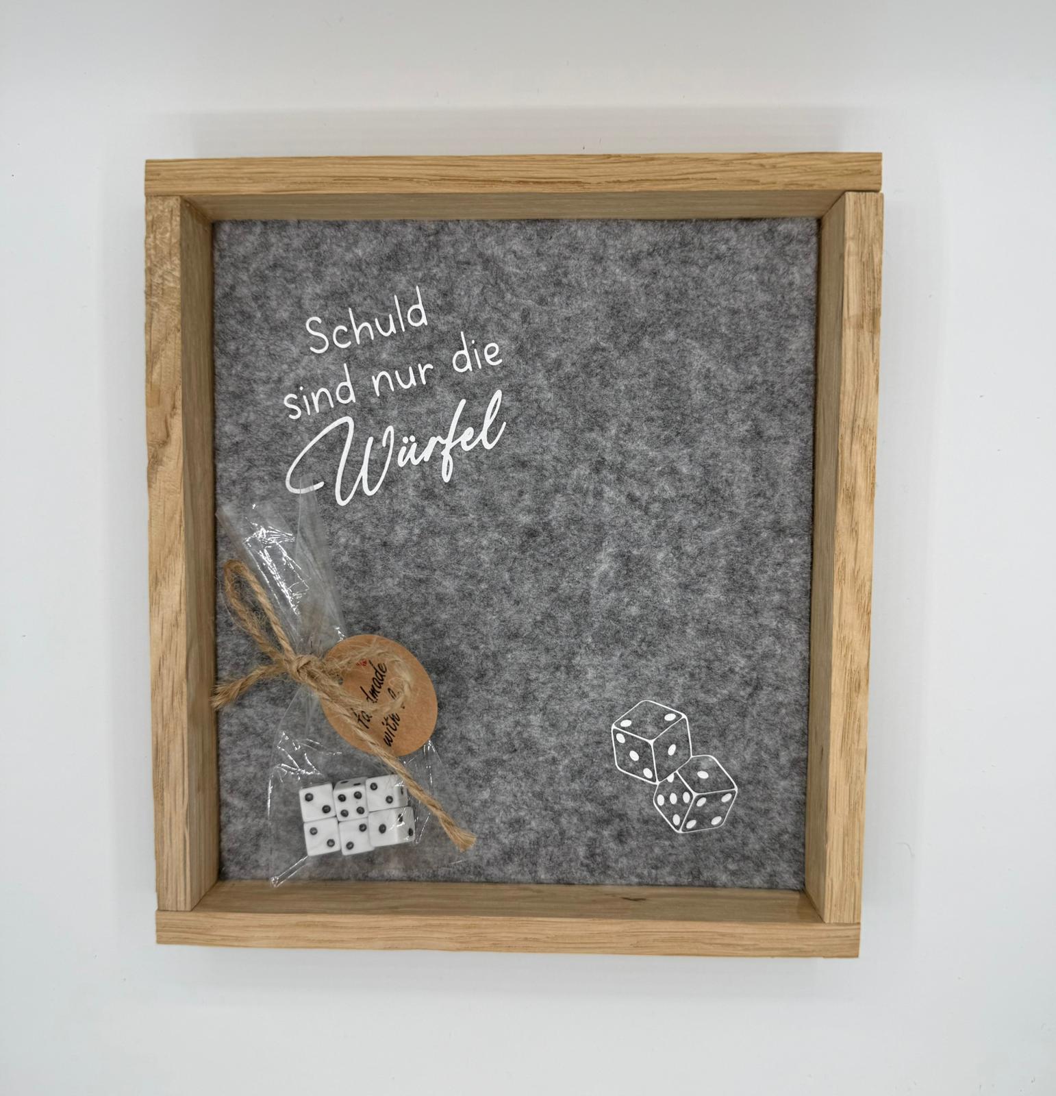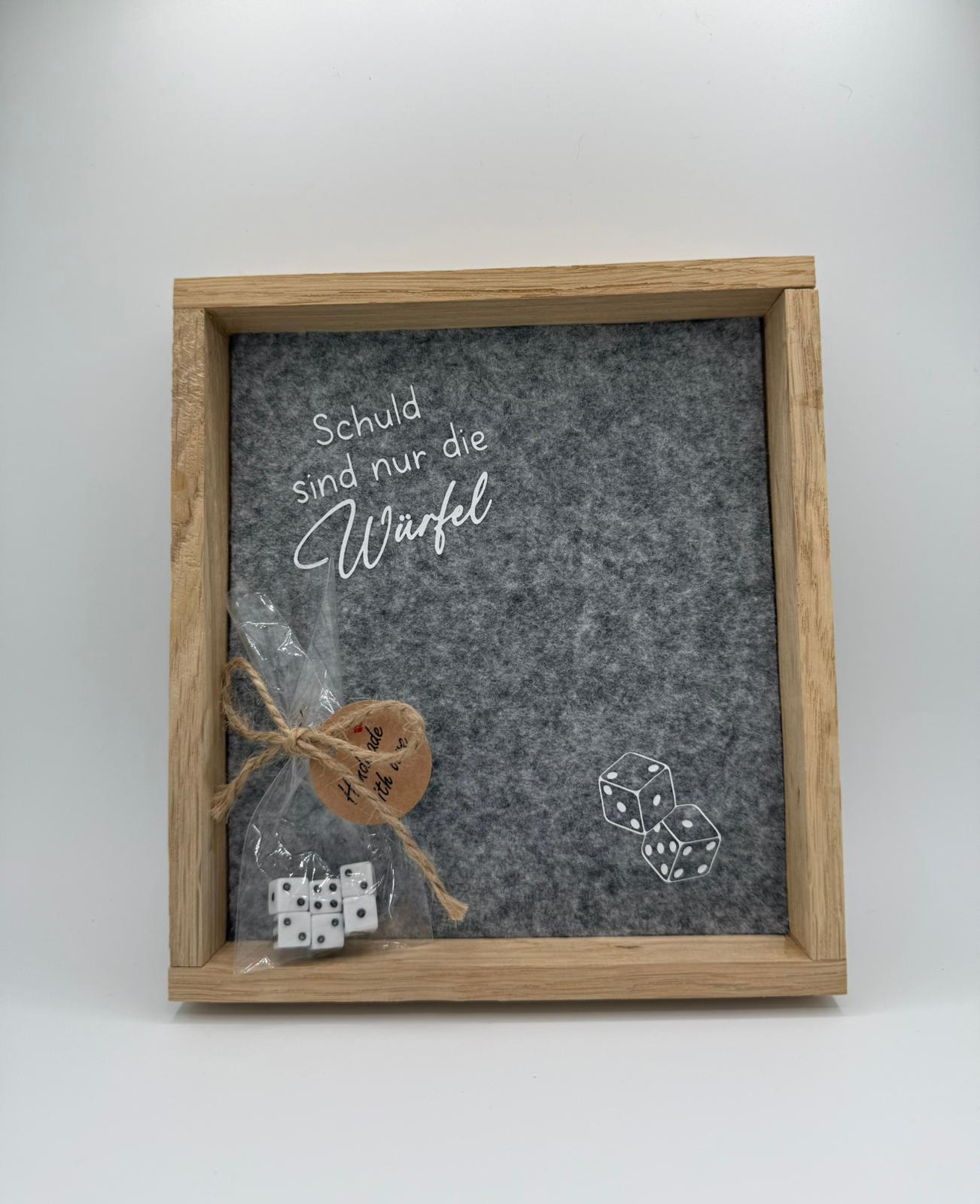 Dieses handgefertigte Würfelbrett ist das perfekte Highlight für jeden Spieleabend. Mit dem humorvollen Spruch „Schuld sind nur die Würfel“ sorgt es garantiert für ein Schmunzeln – ob als Dekoration im Wohnzimmer, als Geschenkidee für Spieleliebhaber oder als originelles Accessoire für den Spieltisch.